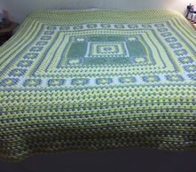 The Pineapple King Sized Afghan in Yellow, Green, Silver and Cream. This took 88 hours because the yarn was bulkier and the hook size was larger.