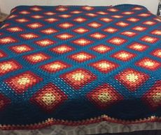 The Tequilla Sunrise Afghan can fit either King or Queen. The granny squares are pieced on the diagonal and the edges are filled with quarter circles. Made with Harvest Red, Autumn Gold, Pumpkin and Teal Blue. This took 165 hours.