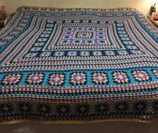 Made with Dark Purple, Lilac, Teal, Autumn Gold and Bone Caron Simply Soft. The yarn is lighter weight so the hook was smaller sized. This took 200 hours.