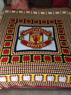 This is another mixed technique of knitting (the center logo) and crocheting. It took 142 hours to create. It is sized for a throw/full size but is pictured on a queen bed.