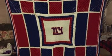 This NY Giants throw is an orginal graphed design. The logo square and long side bars are knitted and the blocks are crocheted. This project took about 75 hours to create.
